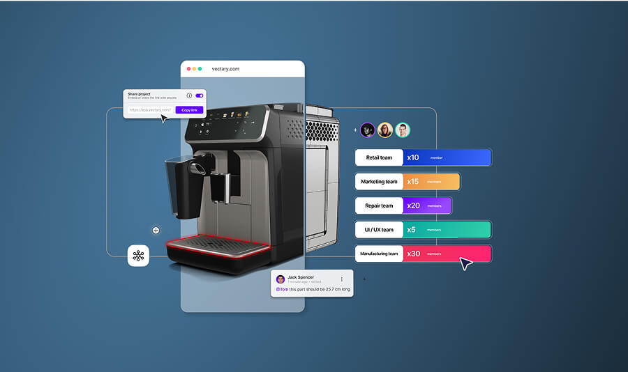 Traditional 3D tools were built for solo work. Enterprise teams need collaboration for PMs reviewing, marketers embedding, engineers adjusting, often in the same day. Vectary platforms supports teams by allowing: